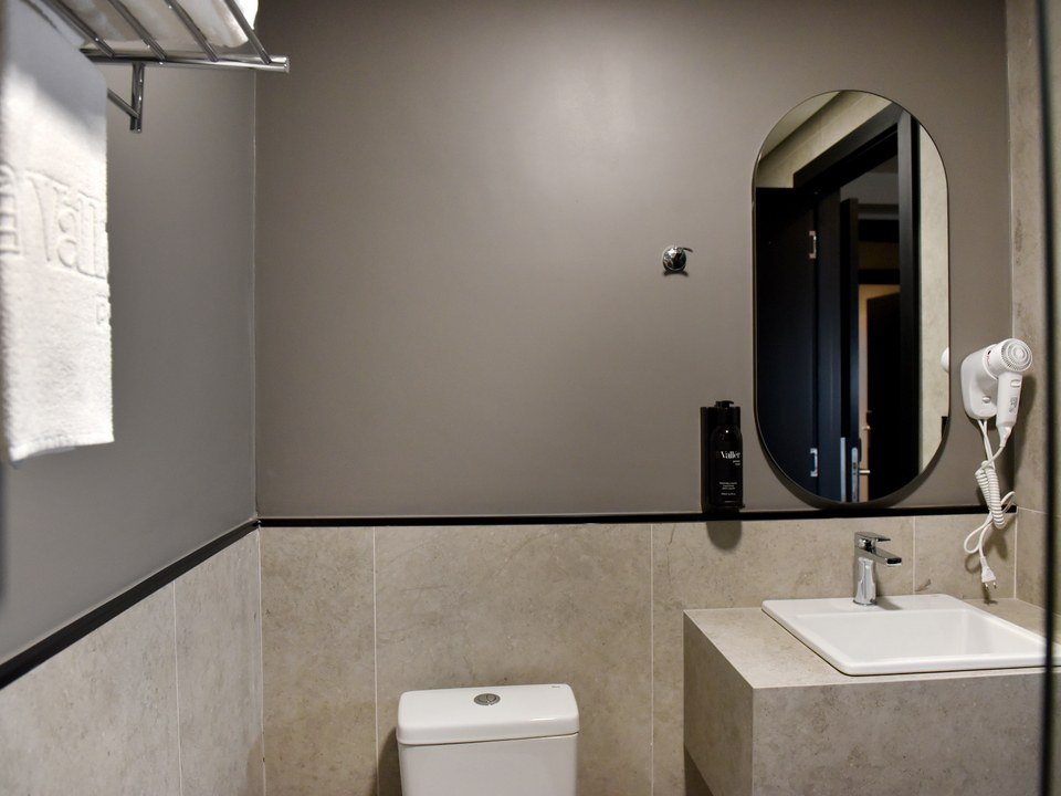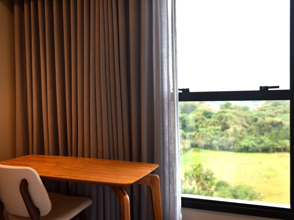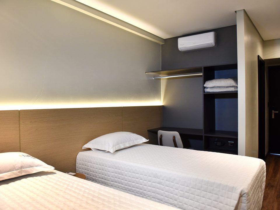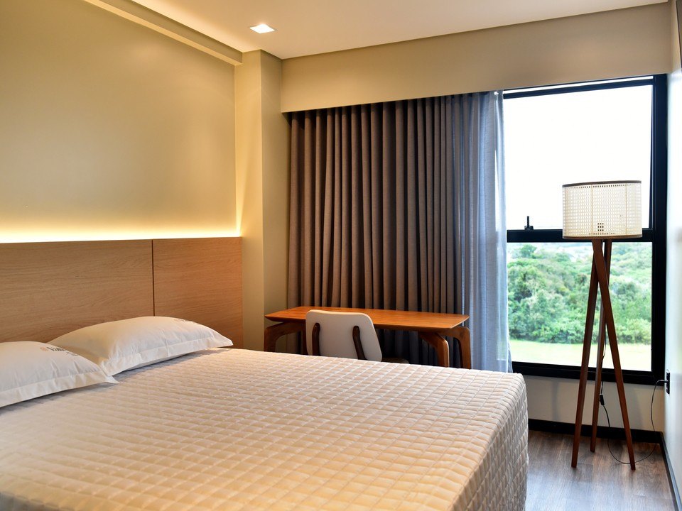 Com cama de casal espaçosa e uma cama de solteiro, enxoval de alta qualidade, iluminação suave e vista privilegiada para a natureza, cada detalhe convida ao relaxamento. A área de trabalho funcional, o ar-condicionado, o frigobar, o cofre e o banheiro privativo completam a experiência com conforto e conveniência, garantindo privacidade e bem-estar durante toda a sua estadia.